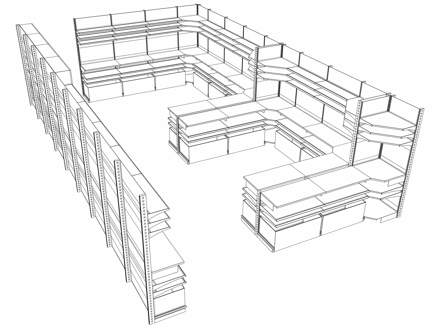 Clients provide us with a 2D layout, and we collaborate to select the ideal shelving profiles. Our team then transforms these plans into a detailed 3D view, offering a realistic preview of the optimized shop design.